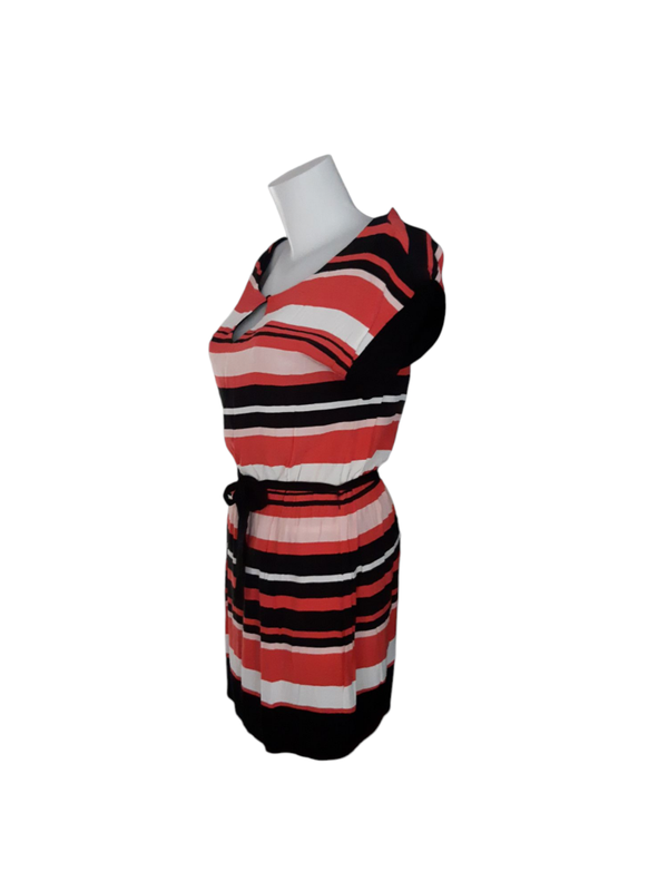 Apportez une touche de dynamisme et de raffinement à votre tenue avec cette robe sans manches Camaïeu. Ses lignes audacieuses dans un harmonieux mélange de noir, blanc et corail lui confèrent une allure moderne et chic, idéale pour toutes les occasions.