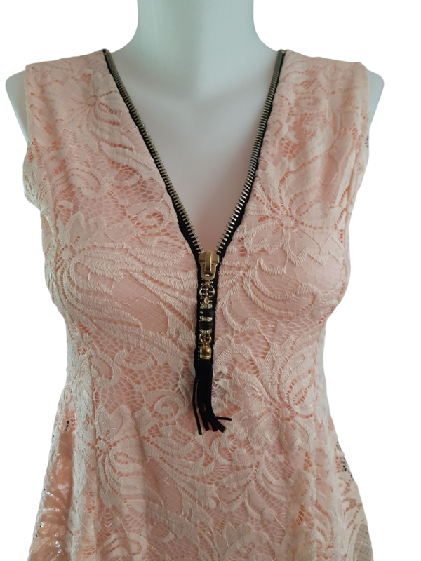 Top asymétrique en dentelle rose avec tirette bijou – Élégance romantique