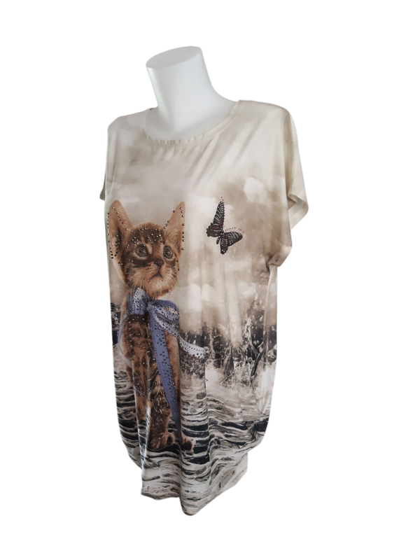 Robe fluide courte - beige avec grand motif chat - strass - Manches courtes