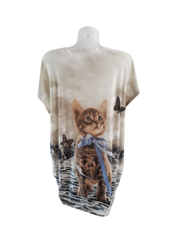 Robe courte et fluide de couleur beige, avec grand motif chat sur le devant orné de strass et imprimé chat sur l'arrière.
