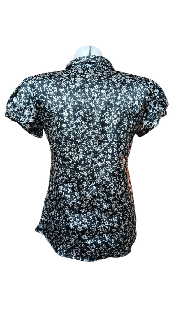 Chemisier en satin noir à motifs floraux blancs – Élégance et raffinement intemporel