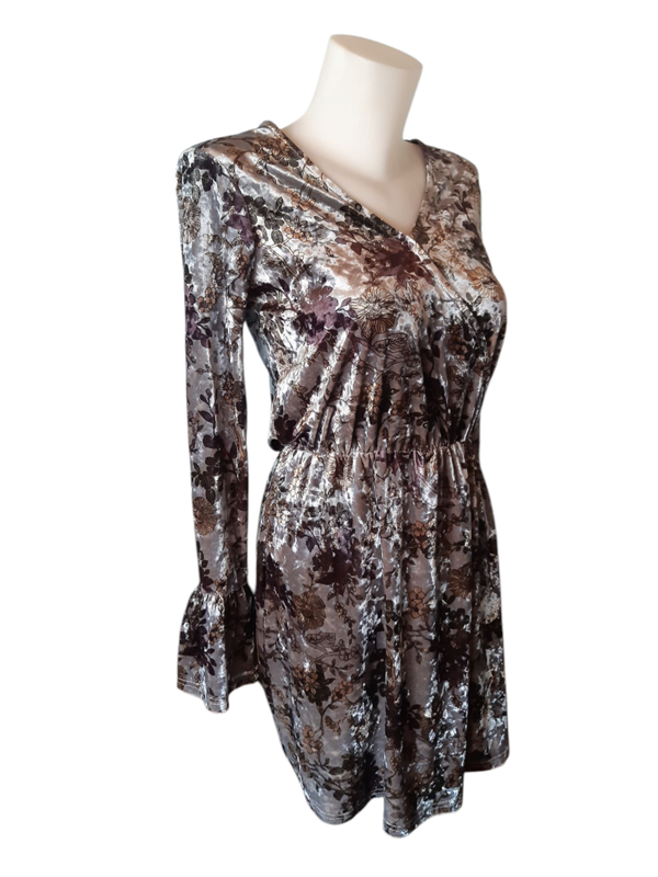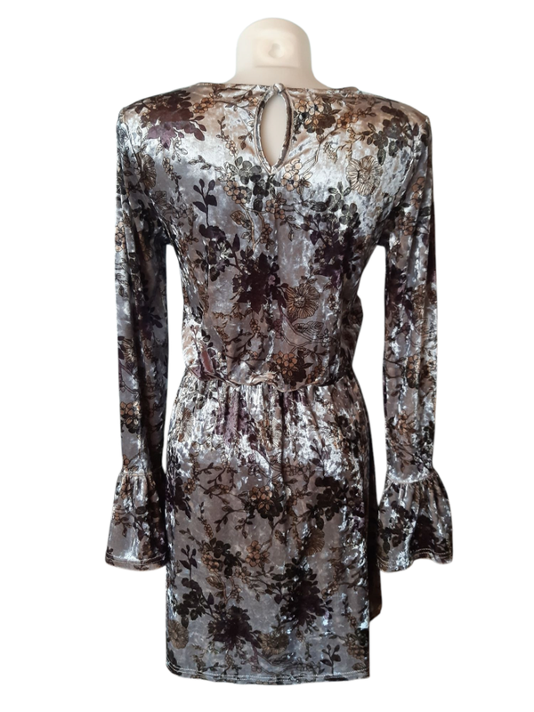 Élégance et douceur se rencontrent dans cette robe longue à manches en velours gris subtilement orné de motifs floraux. Son tissu luxueux offre une texture délicate et un tombé fluide, parfait pour une allure chic et intemporelle.