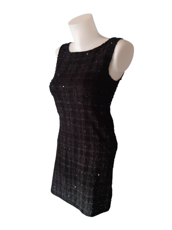 Brillez de mille feux avec cette robe noire sans manches, sublimée par de nombreux détails en sequins qui captent la lumière à chaque mouvement. Son design élégant et intemporel en fait la pièce idéale pour une soirée chic ou une occasion spéciale.