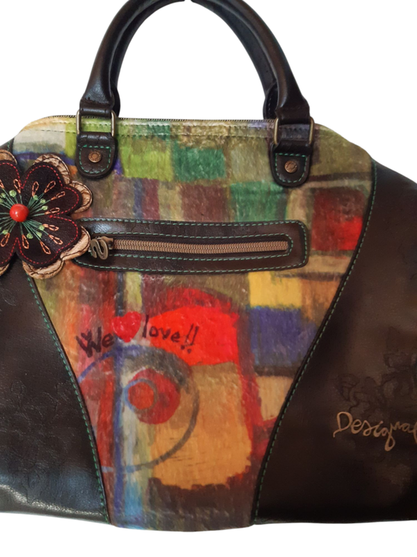 Ajoutez une touche originale à votre tenue avec ce sac spacieux, parfait pour un usage quotidien. Son simili cuir noir gravé de fleurs, associé à des tissus colorés à poil ras en vert et rouge, lui confère un style à la fois chic et audacieux.
